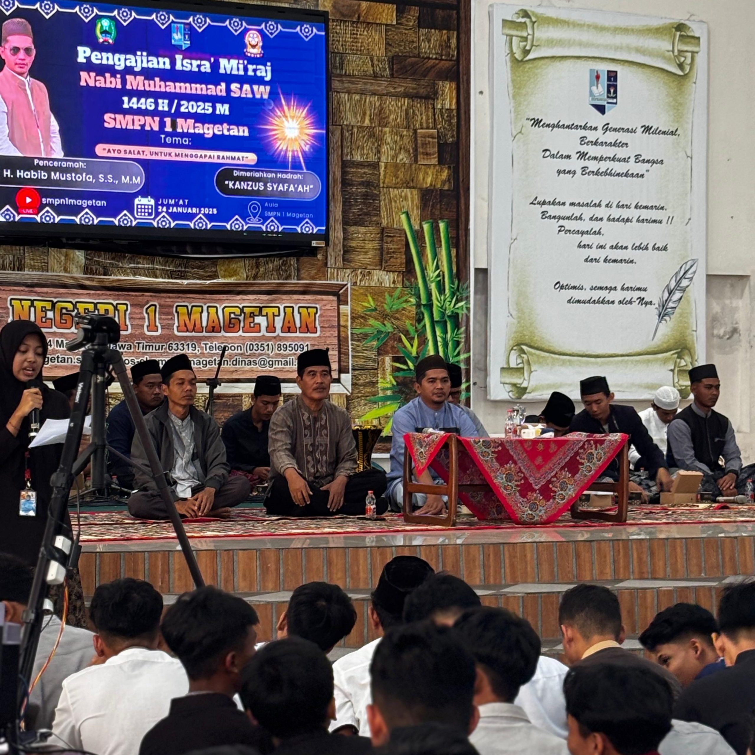 (24/01/2025) SMPN 1 Magetan menyelenggarakan acara untuk memperingati peristiwa Agung. Isra Mi’raj adalah perjalanan Nabi Muhammad S.A.W dari Masjidil Haram ke Masjidil Aqsa, lalu dilanjutkan ke Sidratul Muntaha untuk menerima perintah sholat 5 waktu. Hari ini tepatnya, 24 Januari 2025 SMPN 1 Magetan melaksanakan kegiatan dalam rangka memperingati isra Mi’raj tahun 1446 H/2025. Kali ini, SMPN 1 Magetan menyongsong tema “Ayo sholat, untuk menggapai rahmat” hal tersebut berkaitan dengan mengingatkan Siswa-siswi SMPN 1 Magetan agar senantiasa melaksanakan Sholat ibadah.